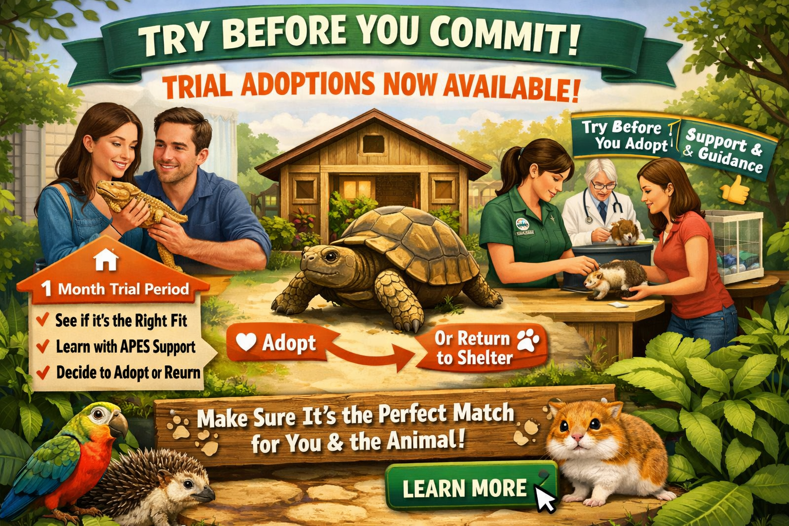 At APES Shelter & Rescue, we know adopting an exotic animal is a big decision. Whether you’re new to caring for reptiles, small mammals, invertebrates, or other exotic species, it’s essential that both you and the animal are confident the match is right.